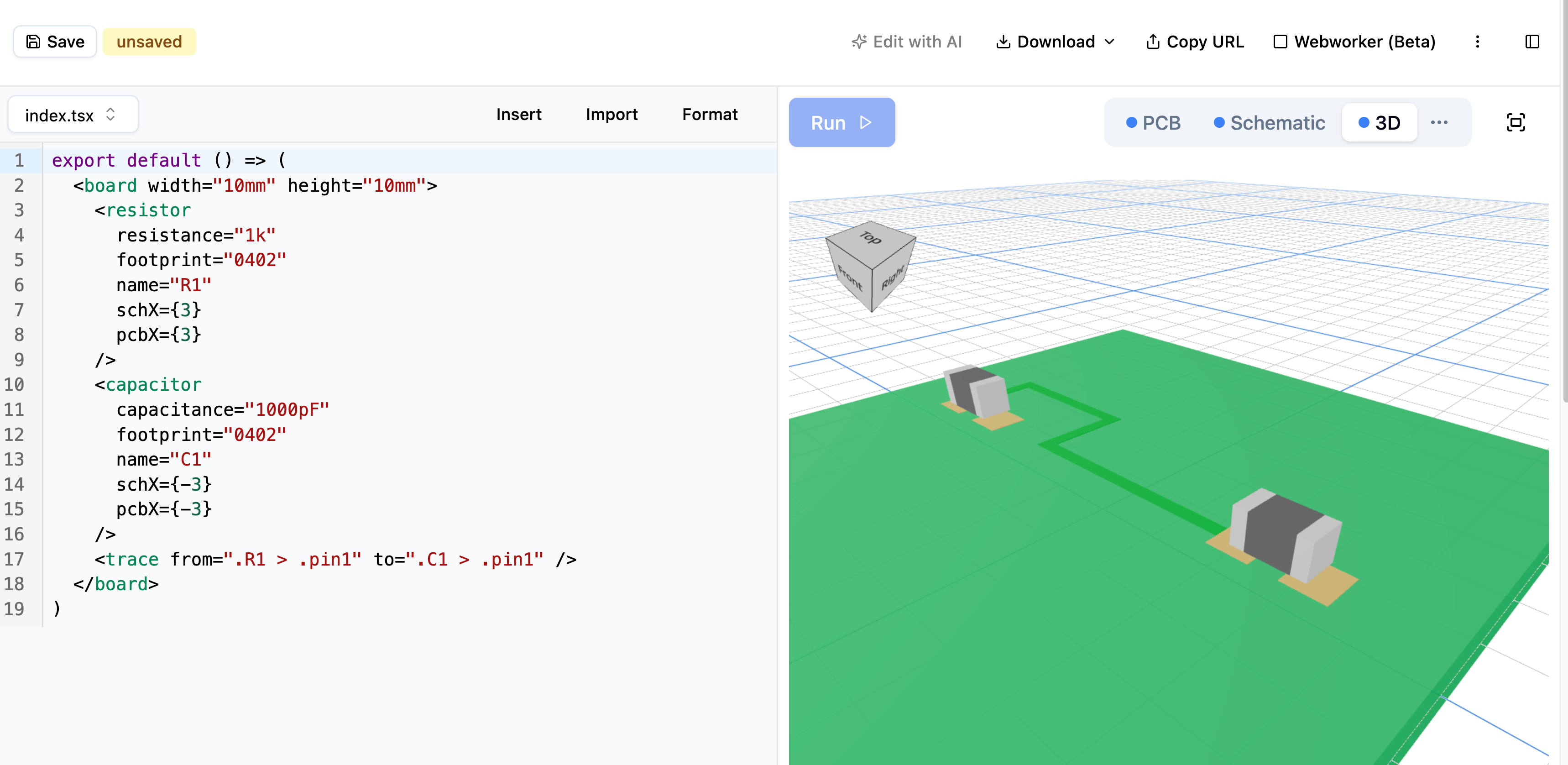 After you make a change, click the "Run" button to see your changes applied. You can use the PCB, Schematic, and 3D views to make sure everything is correctly aligned.
